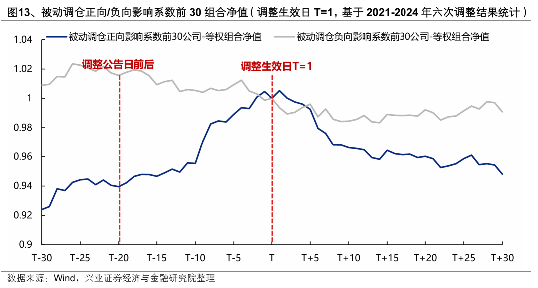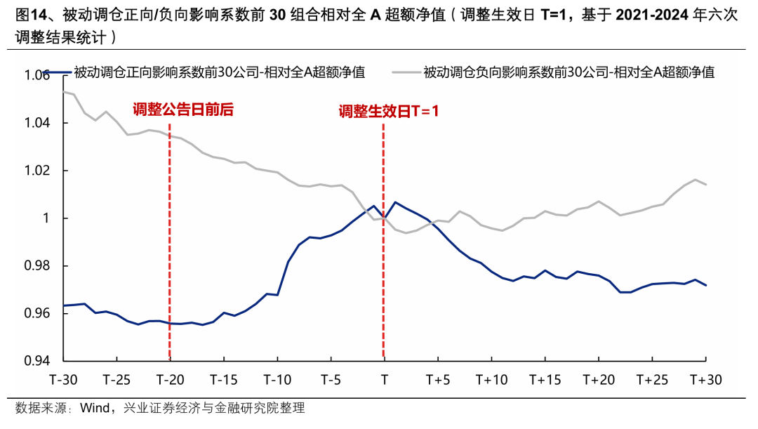 进一步的,以被动调仓正向/负向影响系数排名前30的公司构建等权组合并进行回测,也能够得到一致结论:从调整公告日到正式生效日,受被动调仓正向影响最大的30家公司组合无论绝对收益率还是相对全A的超额收益率均较为显著,而受被动调仓负向影响最大的30家公司则往往会面临调整且相对跑输。在正式生效日后调仓影响减弱,此前受被动调仓正向影响较大的公司甚至可能出现资金兑现回调。