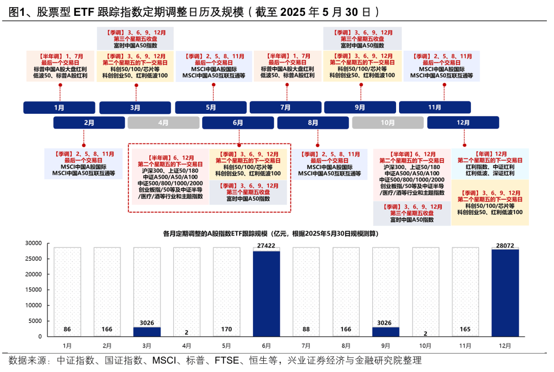 6月指数将迎来年中定期调整,超2.7万亿元股票型ETF将集中调仓。根据中证指数与国证指数公告,沪深主要指数调整将于6月16日收市后正式生效,包括沪深300、上证50/180/380、中证A500/A50/A100、中证500/1000等宽基指数,以及中证半导、中证医疗、中证酒等大部分行业和主题指数将迎来调整。以截至5月末的规模数据测算,6月涉及调整的股票型ETF规模将超过2.7万亿元,涉及调整规模仅略低于今年12月份。