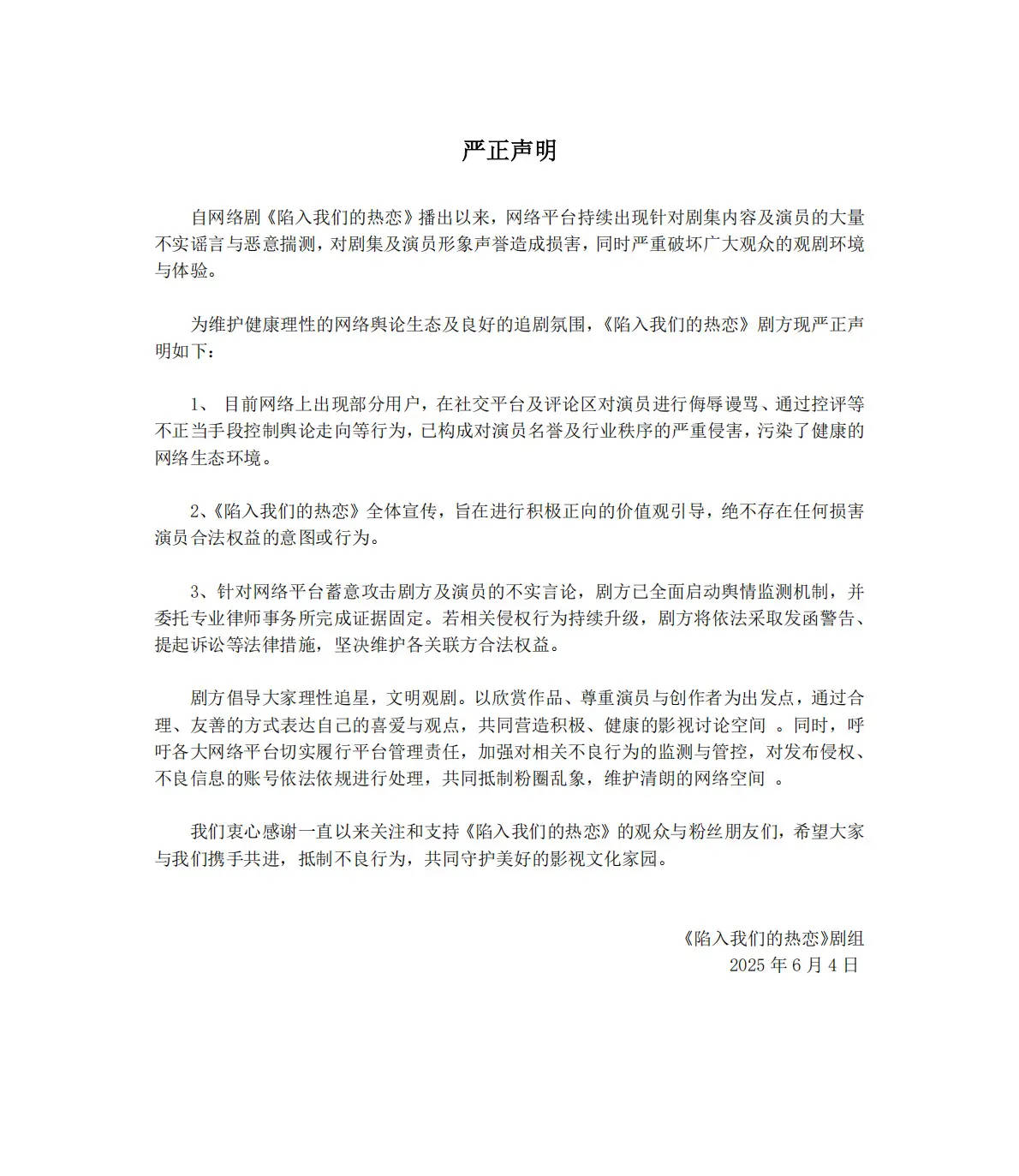 搜狐娱乐讯 6月4日,刘浩存、王安宇主演的新剧《陷入我们的热恋》剧方发布声明,称部分用户对演员进行辱骂,通过控评等方式控制舆论走向,构成对演员名誉的严重侵害。剧方已全面启动舆情监测机制,若侵权行为升级将采取法律手段。剧方呼吁理性追星,文明观剧。