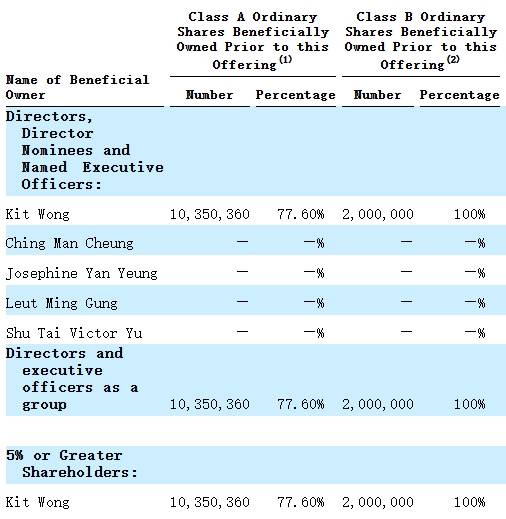 IPO前,Kit Wong持有77.6%的A类股和100%的B类股。