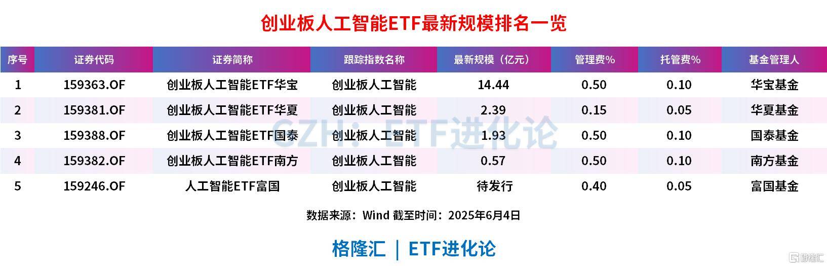 规模角度来看,创业板人工智能ETF华宝最大,最新规模为14.44亿元,创业板人工智能ETF华夏次之,为2.39%。