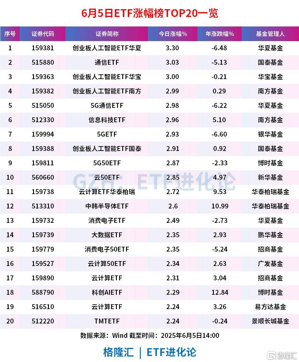 ETF方面,算力相关ETF霸屏涨幅榜,创业板人工智能ETF华夏涨3.3%,国泰基金通信ETF、创业板人工智能ETF华宝分别涨3.03%和3%,创业板人工智能ETF南方涨2.99%,华夏基金5G通信ETF、银华基金5GETF分别涨2.98%、2.93%。