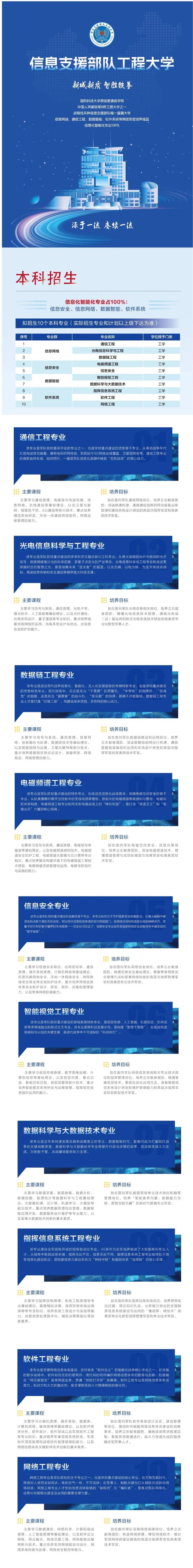 作为全新打造的战略性兵种,信息支援部队唯一直属大学,信息支援部队工程大学首次面向社会招生,10个本科专业100%信息化智能化。