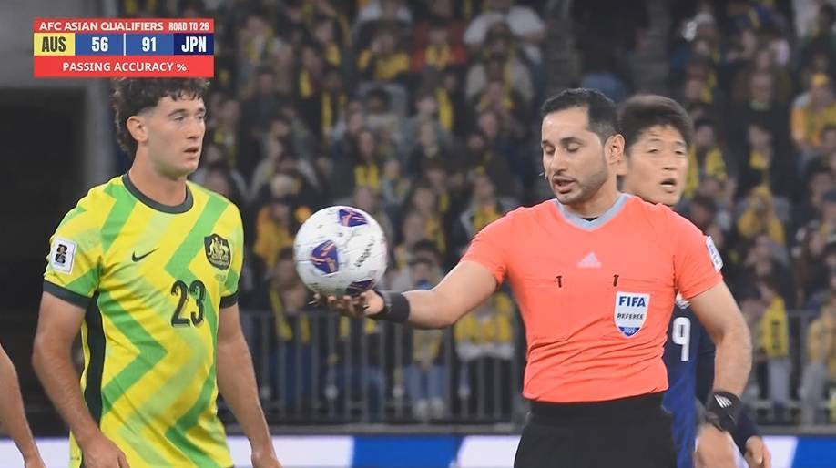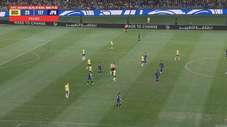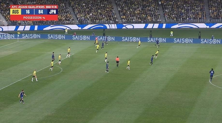 比赛开场10分钟,日本控球率高达84%,共2脚射门0射正,完成了117脚传球,传球成功率高达91% ;澳大利亚仅25脚传球,传球成功率56%,没有完成射门。
