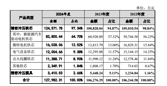 可见,新能源汽车驱动电机铁芯在报告期内持续贡献超50%的营业收入,稳居公司第一大营收来源。