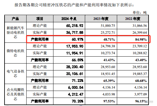 然而,这一扩产计划与公司现有产能利用率数据形成鲜明对比。报告期内,新能源汽车驱动电机铁芯产能利用率分别为84.98%、48.71%、60.97%,近三年均值仅64.89%,且2023年曾低至48.71%,波动显著。那么,在现有产能尚未充分消化的背景下,为何公司仍执意大举扩产?