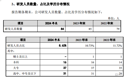 值得注意的是,截至2022年末、2023年末、2024年末,华新精科的研发人员数量分别为79人、85人、84人,其中学历在本科以下的研发人员数量为64人、68人、68人,占比研发人员总数的比例分别为81.01%、80%、80.95%。这不免令人疑惑,在普遍认为高学历人才主导技术创新的行业环境下,华新精科如何凭借较低学历的研发团队,持续保持技术优势并实现高毛利率?
