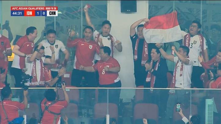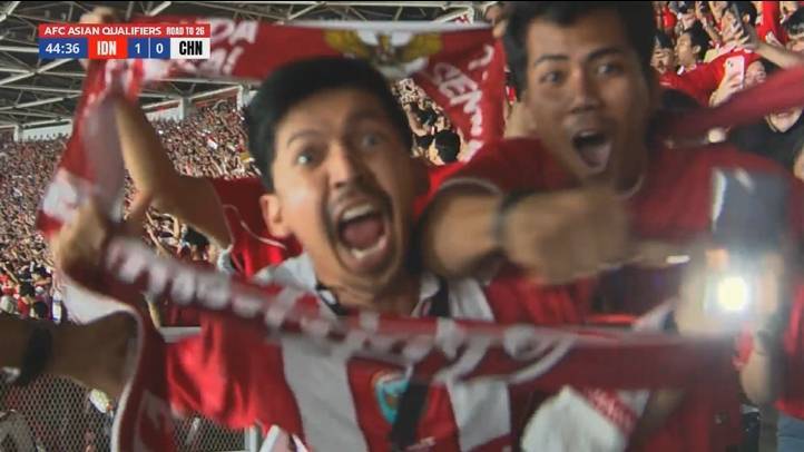 陷入狂欢,印尼点射对国足取得领先,主场印尼球迷载歌载舞欢呼