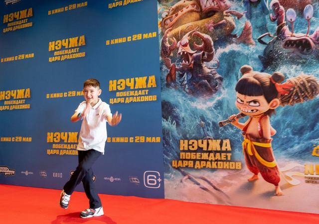 5月25日,在俄罗斯首都莫斯科,一名男孩在《哪吒之魔童闹海》媒体场首映后与主题背景板合影。新华社记者 孟菁 摄