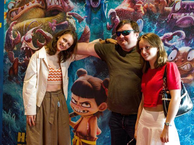5月25日,在俄罗斯首都 莫斯科,人们在《哪吒之魔童闹海》媒体场首映后与主题背景板合影。新华社记者 孟菁 摄