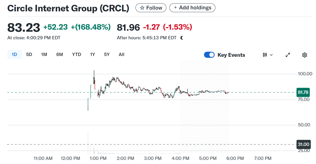 当地时间周四,稳定币“第一股”Circle Internet Group Inc.(CRCL)美国IPO首日开盘涨122%,报69美元,远高于此前给出的IPO发行价每股31美元。Circle公司盘中一度飙升235%,上涨至103.75美元的高点。截至周四美股收盘,Circle收涨近170%,表现远超当日美股大盘。