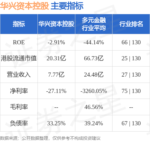 华兴资本控股港股市值20.31亿港元,在多元金融行业中排名第25。主要指标见下表: