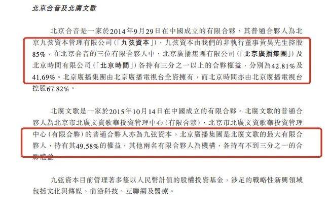 穿透股权来看,北京合音以及持股3.45%的北广文歌背后,均有北京广播集团;中移基金身后,其普通合伙人更是由国投创新投资管理有限公司及中国移动通信集团有限公司分别持股46%及45%。