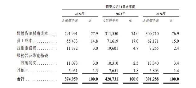 而媒体资源采购成本为销售成本的最大组成部分,2022年至2024年分别为2.92亿元、3.116亿元及3.007亿元,分别占同年总销售成本的77.9%、74.0%及76.9%。