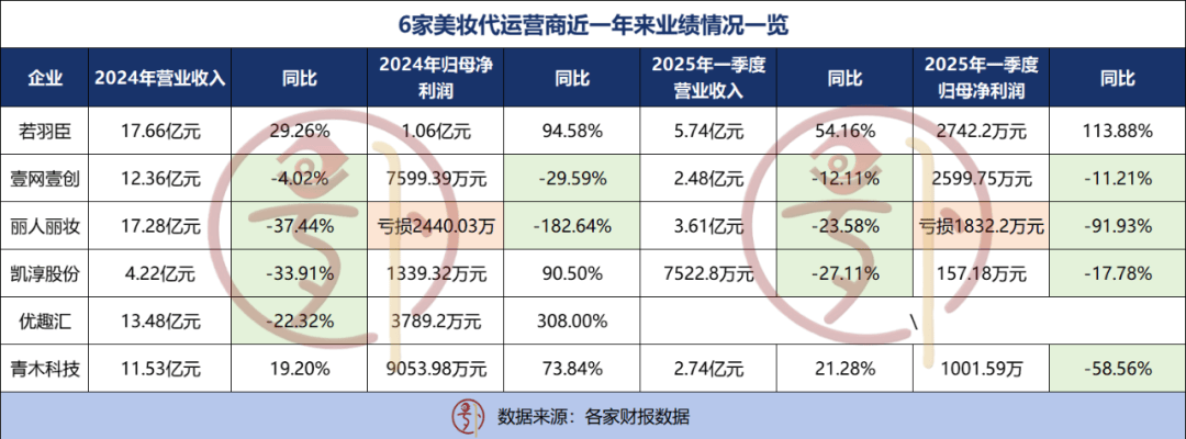 从营业收入来看,在2024年,6家美妆代运营商中,仅若羽臣和青木科技两家企业维持营收增长态势,其余4家企业均面临不同程度的业绩下滑;这一趋势延续至2025年一季度,除优趣汇尚未披露数据外,同样只有上述两家企业保持营业收入增长。
