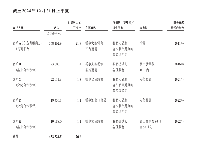 但在凯诘电商最新招股书披露的前五大客户里,已经不见高露洁的身影。尽管凯诘电商未公布客户具体公司名称,但根据前五大客户的主营业务与开始业务关系年份可以判断,高露洁明显已不在其中。