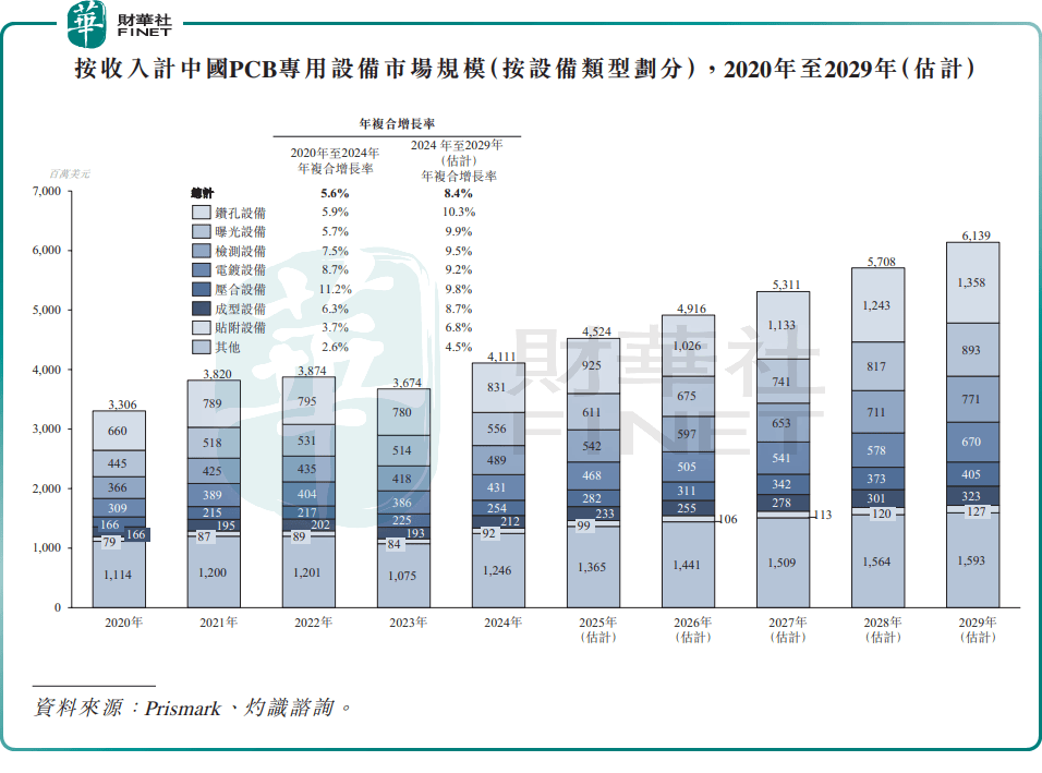 灼识咨询资料显示,中国PCB专用设备行业的市场规模由2020年的约33.06亿美元增至2024年的约41.11亿美元,年复合增长率为5.6%,预计到2029年将以8.4%的年复合增长率增长,达到约61.39亿美元。