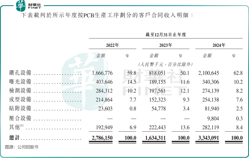 其中,钻孔设备为公司主要收入来源,2024年收入占比达62.8%;其次是曝光设备,2024年收入比重为10.2%。据悉,该两个细分领域是PCB专用设备中价值相对较高且于整体生产流程具有关键重要性的两大类别。