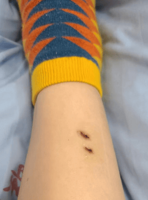 女子详细回忆了当时被咬后的处理情况:“2年前我去云南普洱旅游,晚上在酒店房间里发现自己被毒蛇咬了。到医院后医生取了我的伤口血液去检测,然后给伤口放血,接着扎阻断药,就是在伤口外沿十厘米左右的地方围着腿打一圈,疼得全身是汗,根本忍不住。大夫可能一开始就判断咬我的大概率是银环蛇,所以主要给我扎银环蛇血清。第一支血清扎到一半,护士跑进来说“银环蛇毒阳性”,后来好像一共扎了十多支。”