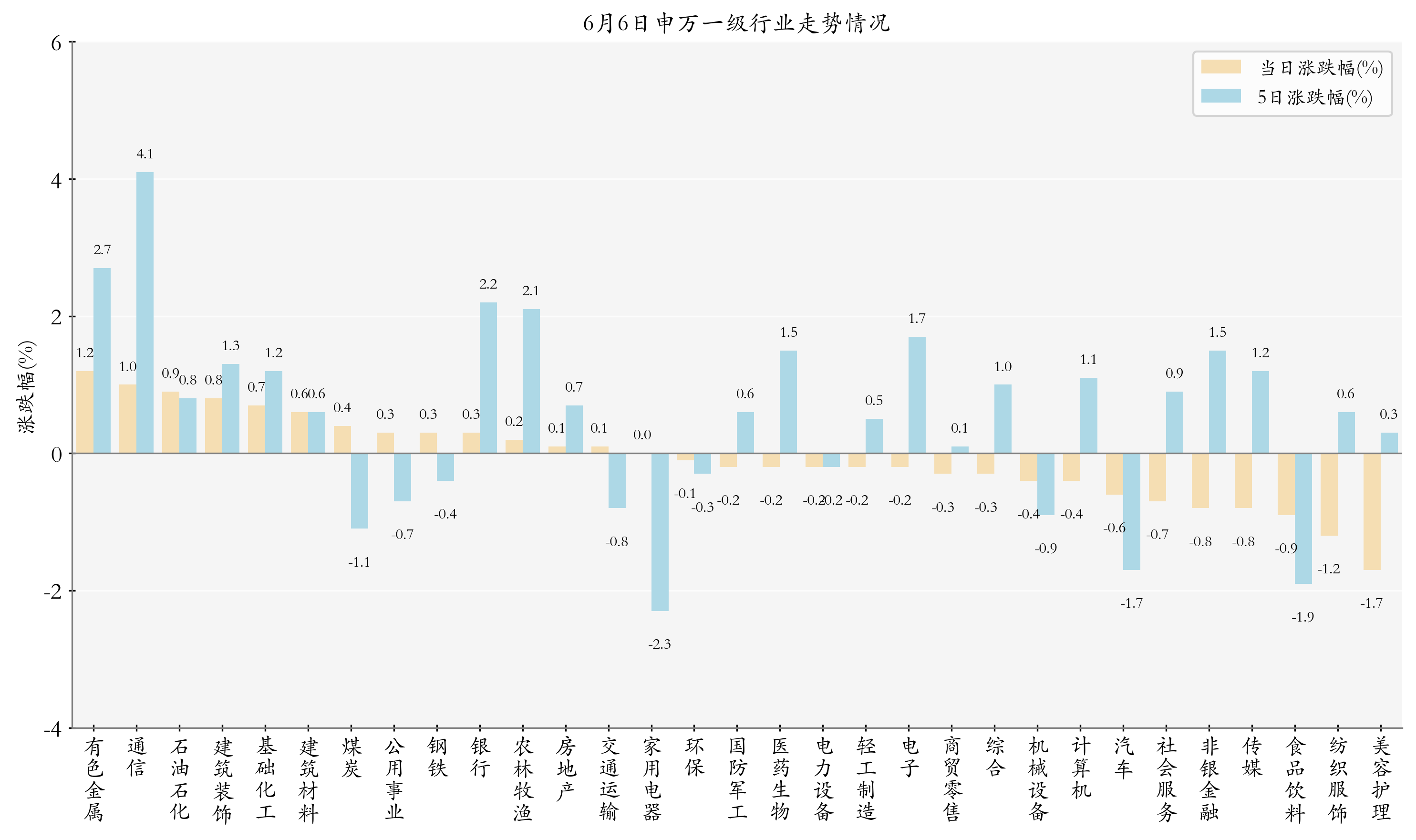 统计今日全部申万一级行业涨跌幅情况,有色金属、通信与石油石化今日走势排名靠前,日涨跌幅分别为1.16%、1.0%与0.88%,美容护理、纺织服饰与食品饮料的走势排名靠后,日涨跌幅分别是-1.7%、-1.18%与-0.92%;近5个交易日通信、有色金属与银行的走势排名靠前,近5日涨跌幅分别为4.06%、2.72%与2.21%,家用电器、食品饮料与汽车的走势排名靠后,近5日涨跌幅分别为-2.32%、-1.92%与-1.74%。