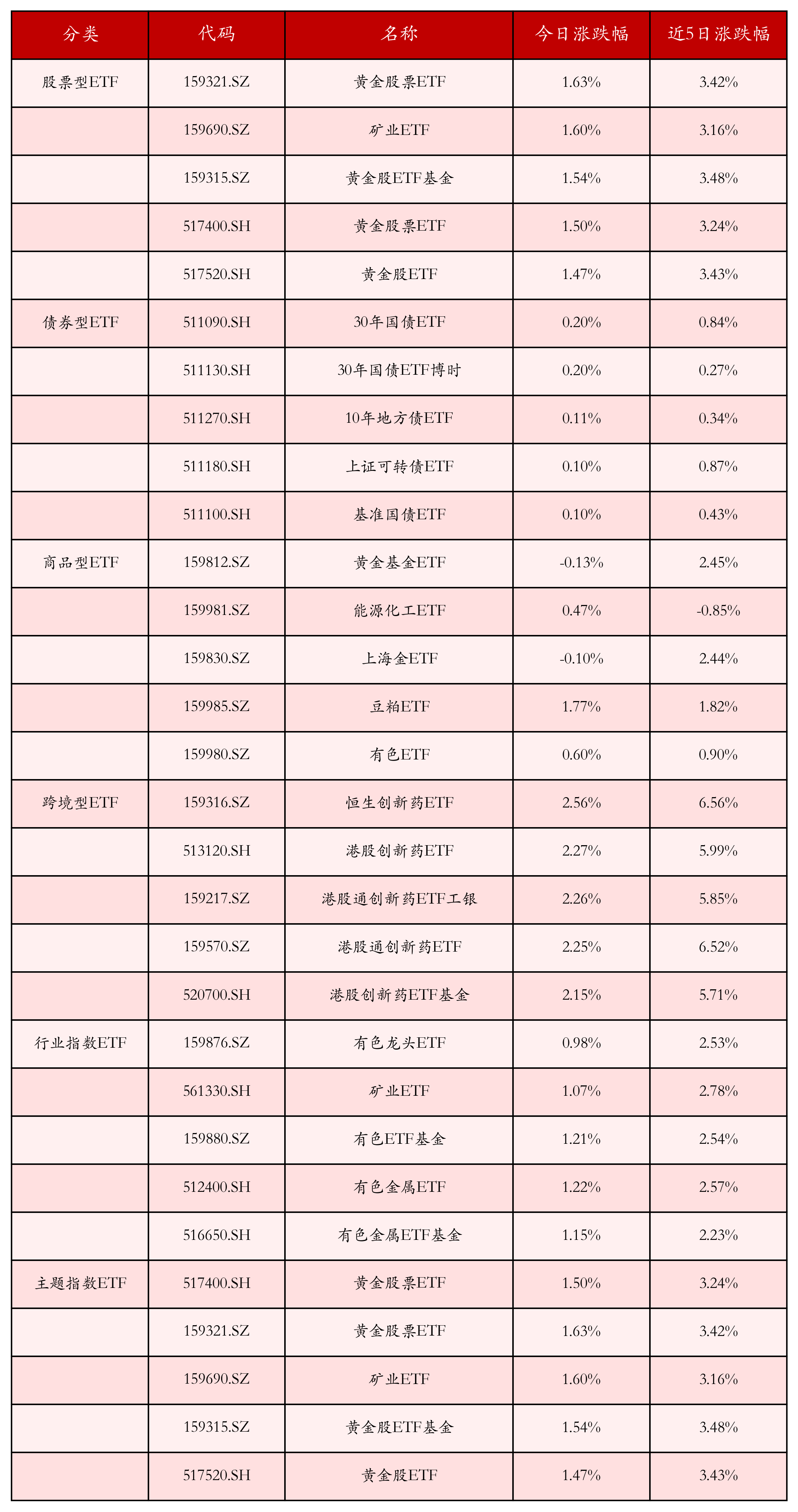 从不同投资种类、行业、主题的ETF产品中找出今日走势行情排名前5的ETF基金,今日涨幅靠前的ETF产品如下表所示。股票型ETF中涨跌幅排名前3位的ETF产品分别为黄金股票ETF(159321.SZ)、矿业ETF(159690.SZ)和黄金股ETF基金(159315.SZ),今日收益率分别为1.63%、1.60%和1.54%。