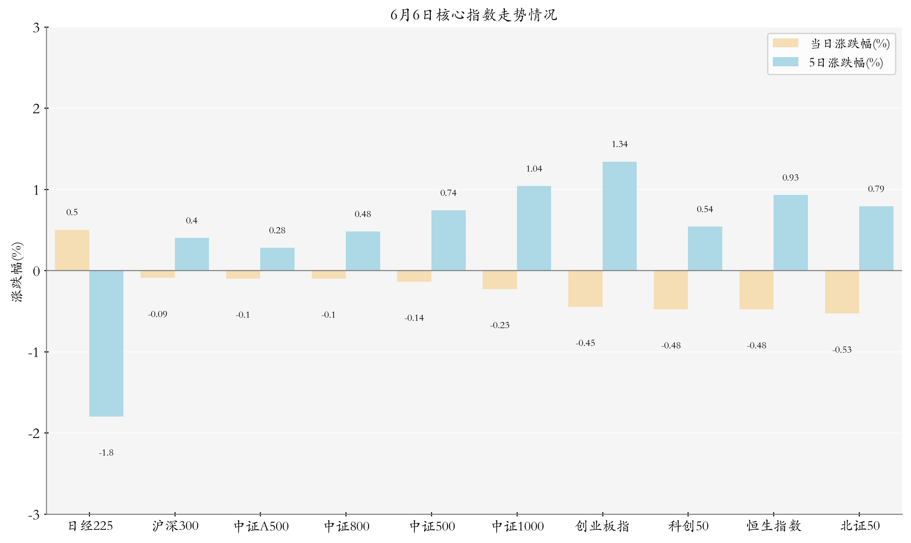 统计A股与海外主要核心指数走势,今日(6月6日,下同)三大指数涨跌不一,其中上证指数上涨0.04%,收于3385.36点,日内最高3391.45点;深证成指下跌0.19%,收于10183.7点,日内最高10223.56点;创业板指下跌0.45%,收于2039.44点,日内最高2051.91点。今日日经225、沪深300与中证A500走势排名靠前,日涨跌幅分别为0.5%、-0.09%与-0.1%;近5个交易日创业板指、中证1000与恒生指数的走势排名靠前,近5日涨跌幅分别为1.34%、1.04%与0.93%。
