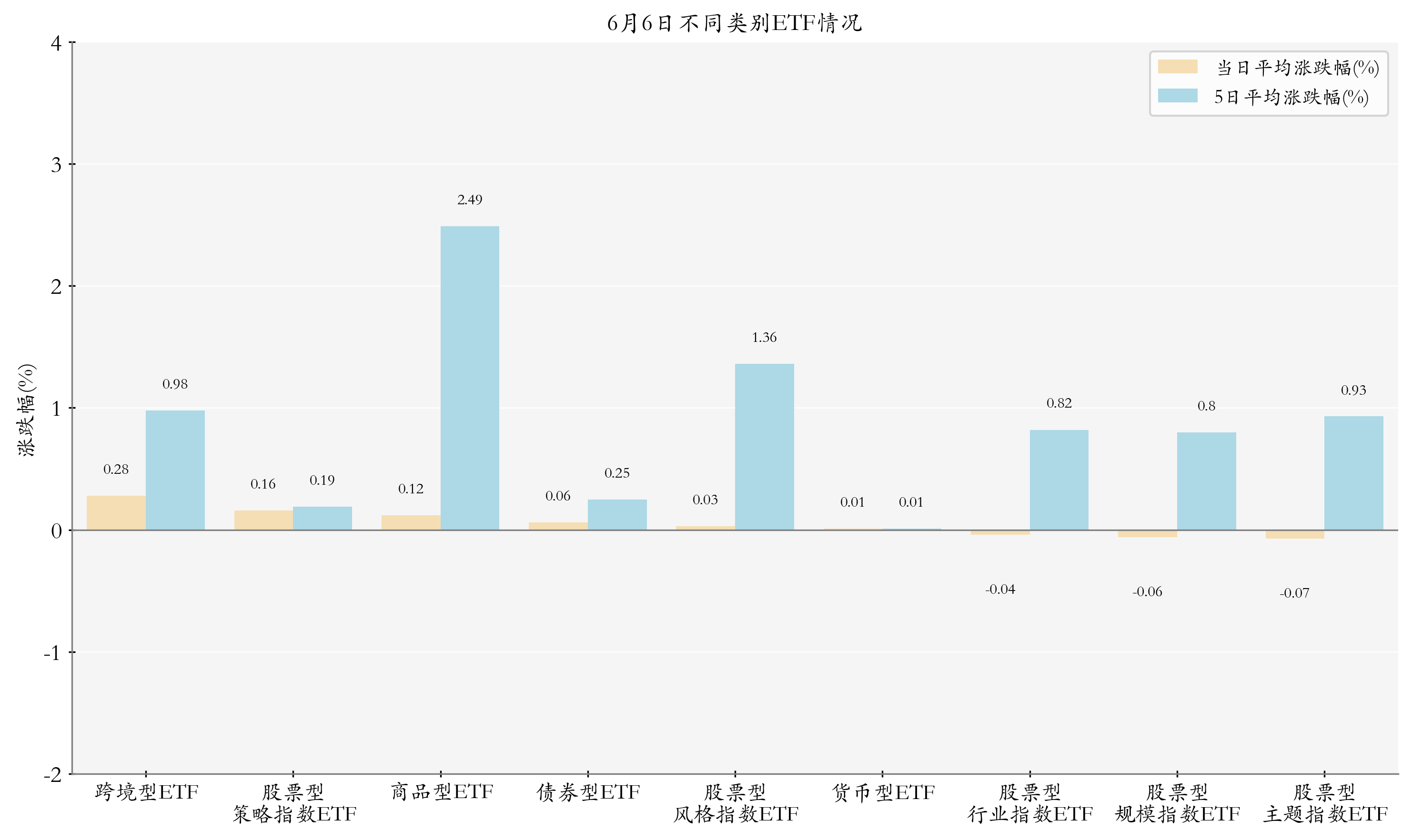 根据ETF基金的投资范围,将ETF基金划分为股票型规模指数ETF、股票型行业指数ETF、股票型策略指数ETF、股票型风格指数ETF、股票型主题指数ETF、债券型ETF、商品型ETF、货币型ETF、跨境ETF,今日跨境型ETF表现最优,该类ETF的平均涨跌幅为0.28%;股票型主题指数ETF的表现最差,该类ETF的平均涨跌幅为-0.07%。