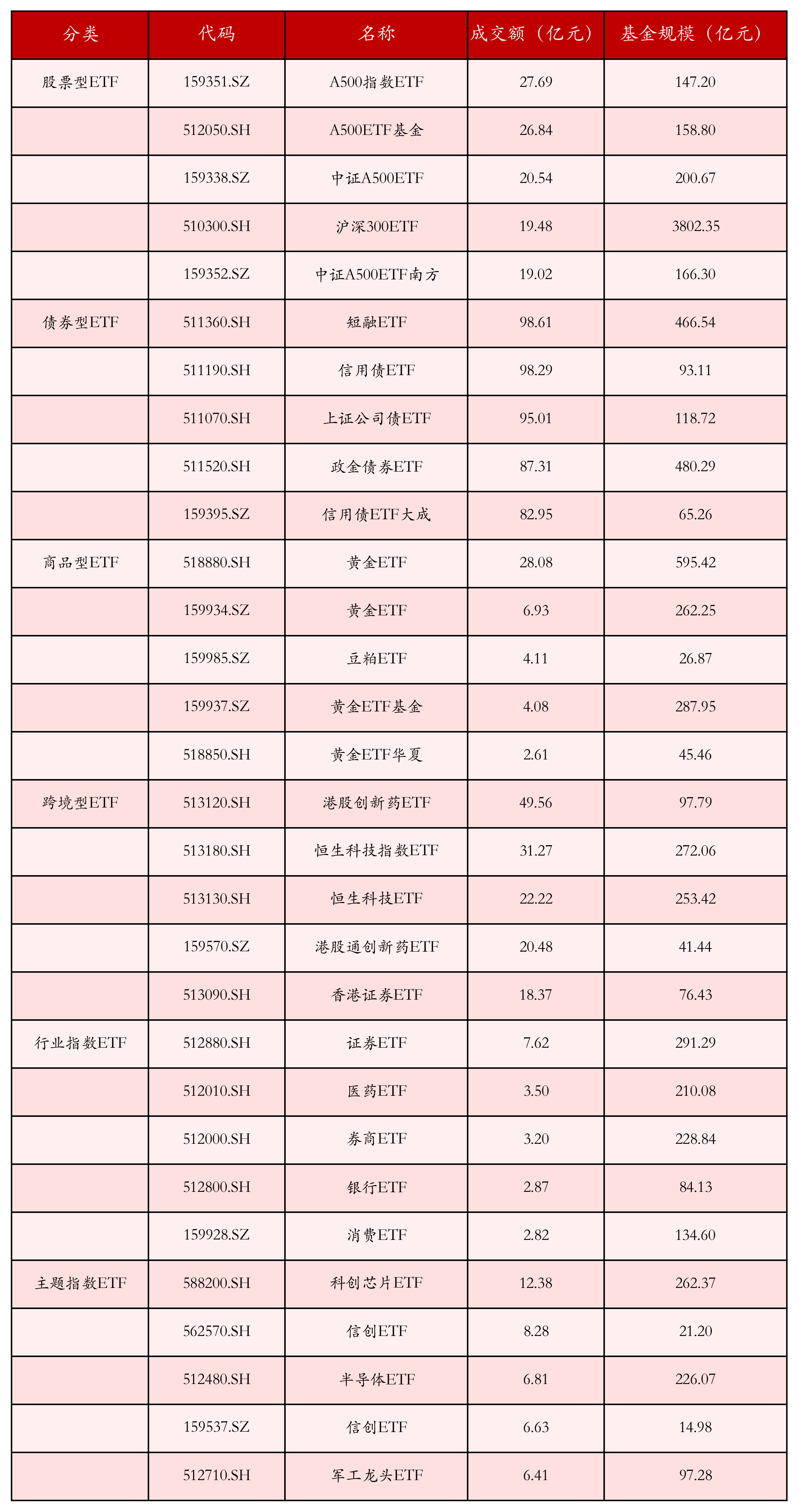 基于成交额对各类ETF今日的成交情况进行统计,成交额靠前的ETF产品如下表所示。股票型ETF中成交额排名前3位的ETF产品分别为A500指数ETF(159351.SZ)、A500ETF基金(512050.SH)和中证A500ETF(159338.SZ),今日成交额分别为27.69亿元、26.84亿元和20.54亿元。
