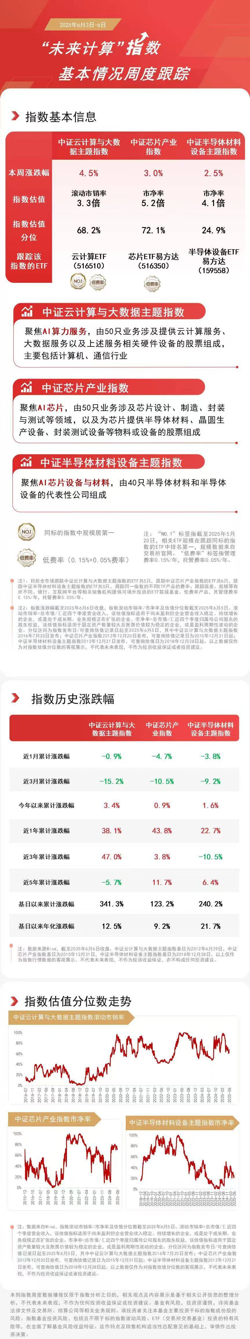 本周中证云计算与大数据主题指数上涨4.5%,中证芯片产业指数上涨3.0%,中证半导体材料设备主题指数上涨2.5%。