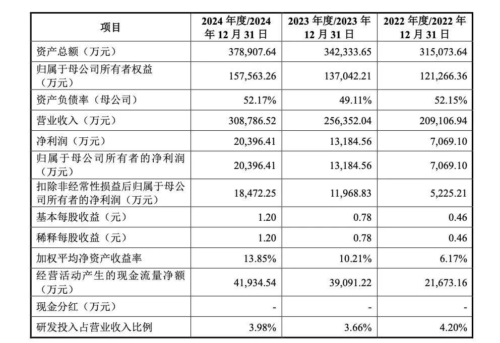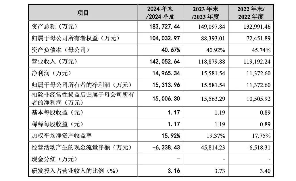 2022年至2024年,华新精科营业收入分别为11.92亿元、11.89亿元及14.21亿元,年均复合增长率为9.17%;净利润分别为1.14亿元、1.56亿元及1.5亿元,年均复合增长率为14.71%。