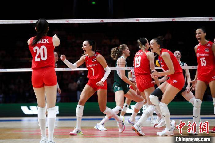 6月7日,在国家体育馆举行的2025世界女排联赛(中国北京站)中,土耳其女排以3:2战胜波兰女排。图为土耳其女排队员(红衣)庆祝得分。中新社记者 张祥毅 摄