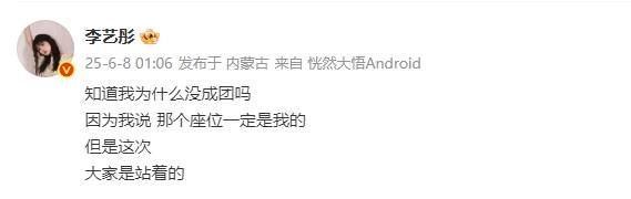 搜狐娱乐讯 8日,李艺彤在社交平台上发文回应在《乘风2025》没进入成团名单一事,她表示:“知道我为什么没成团吗?因为我说,那个座位一定是我的,但是这次,大家是站着的。”