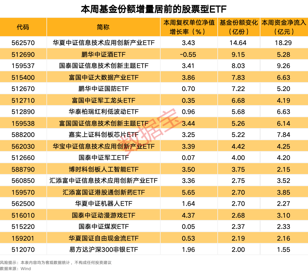 本周场内股票型ETF中,有35只ETF基金份额增加超亿份。
