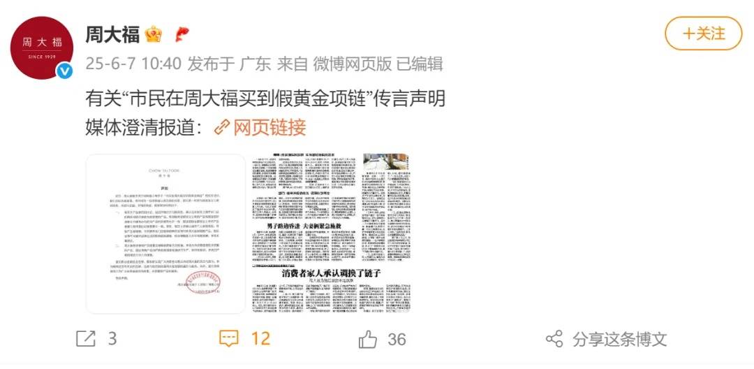 6月6日,周大福就此事发布声明。周大福表示,经过仔细比对与核实后,确认当天该顾客携带至门店的两条项链均非周大福原销售的产品。现场检查发现该顾客所持产品有明显损坏迹象,外观形态与公司产品的外观形态不一致,现场复称发现该顾客所持产品重量与公司售出记录重量不一致。