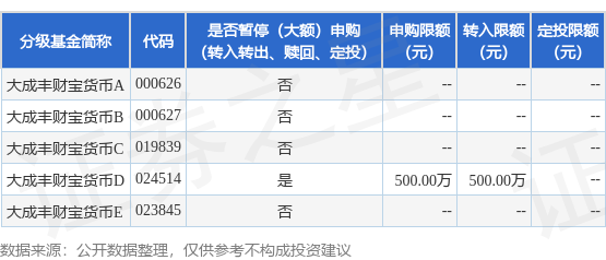 证券之星消息,6月9日大成基金管理有限公司发布《关于大成丰财宝货币市场基金D类份额暂停大额申购(含定期定额申购)及转换转入业务的公告》。公告中提示,为维护基金份额持有人利益,保障基金的平稳运作,自2025年6月9日起大成丰财宝货币市场基金D类份额暂停大额申购(含定期定额申购)及转换转入业务,申购、转换转入上限金额为500.0万元,下属分级基金调整明细如下: