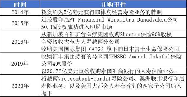 正如前文所说,自从成立初期开始,并购一直是富卫集团的扩张道路上的主旋律。从公开披露的数据显示,在2014年至2020年期间,富卫集团至少完成了十余笔并购交易,投入了至少200亿的资金,并迅速确立其市场地位。