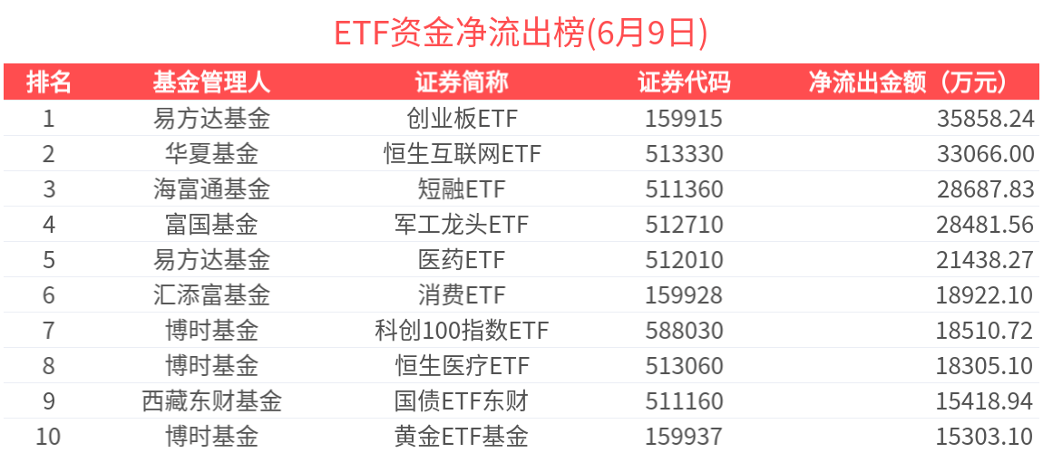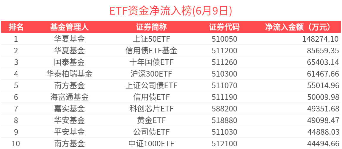 2025年6月9日共212只ETF基金获资金净流入,390只ETF基金净流出。净流入金额超1亿元的有38只,上证50ETF(510050.SH)、信用债ETF基金(511200.SH)、十年国债ETF(511260.SH)、沪深300ETF(510300.SH)、上证公司债ETF(511070.SH)资金显著流入,分别净流入14.83亿元、8.57亿元、6.54亿元、6.15亿元、5.50亿元(净申购份额*单位净值)。