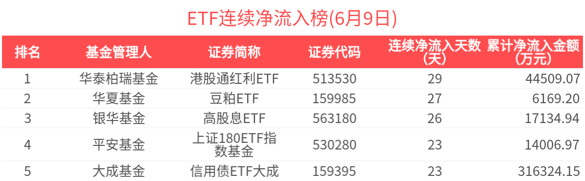 近期连续净流入的ETF基金有110只,居前的为港股通红利ETF(29天)、豆粕ETF(27天)、高股息ETF(26天)、上证180ETF指数基金(23天)、信用债ETF大成(23天),分别净流入4.45亿元、6169.20万元、1.71亿元、1.40亿元、31.63亿元。其中,豆粕ETF近27天加速流入,近27天累计流入6169.20万元,基金规模快速增长至27.44亿元。