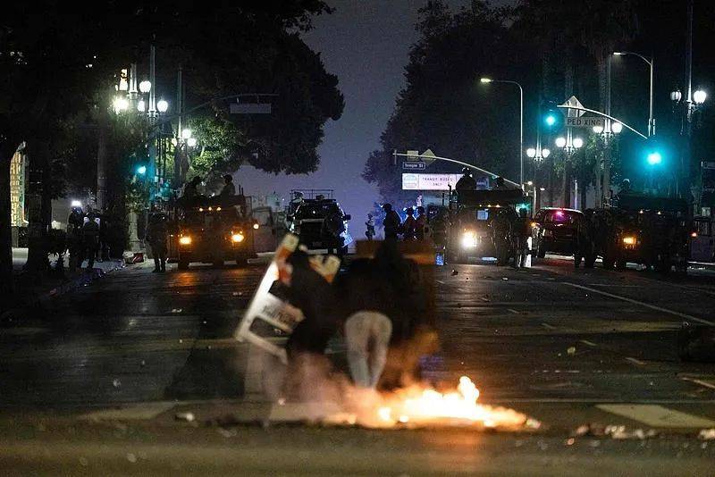 7日,特朗普签署总统备忘录,在纽森没有请求支援的情况下,下令国防部部署2000名国民警卫队人员进驻洛杉矶地区。8日,300名加州国民警卫队人员部署到位。当天,在洛杉矶市中心联邦执法机构门前的抗议者与部署在该地的国民警卫队人员发生激烈冲突。