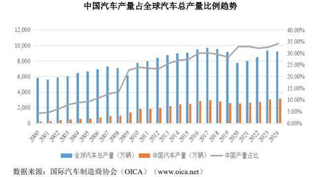 从地区分布看,全球汽车消费市场存在着多极化格局,主要消费地区集中在亚太、北美和欧洲,整体与地区经济发达程度相关。随着西方发达国家汽车产业的成熟和发展中国家国民收入水平的提高,全球汽车的消费重心逐渐由发达国家向以中国为代表的发展中国家转移。根据国际汽车制造商协会(OICA)的统计数据,中国市场的份额尤为突出,已成为全球汽车产量最高的国家,2024年度中国汽车产量占全球汽车总产量已达34.11%,占比超三分之一。
