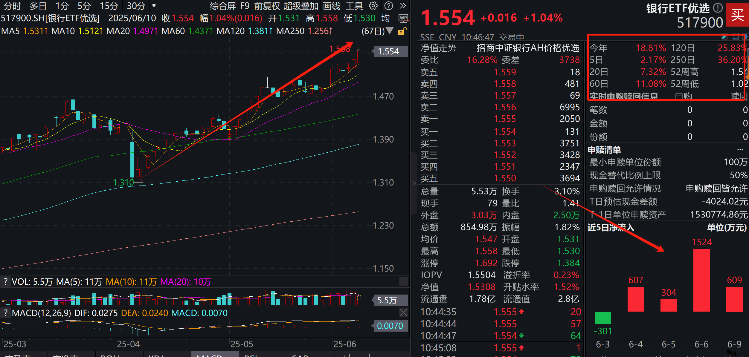 今年以来,银行ETF优选(517900)已经累计上涨17.58%,远超沪深300、沪指、创业扳指等大盘指数;并且屡创历史新高,昨天收盘和今天盘中都刷新了历史新高,并且近几个交易日还有大幅资金持续流入。