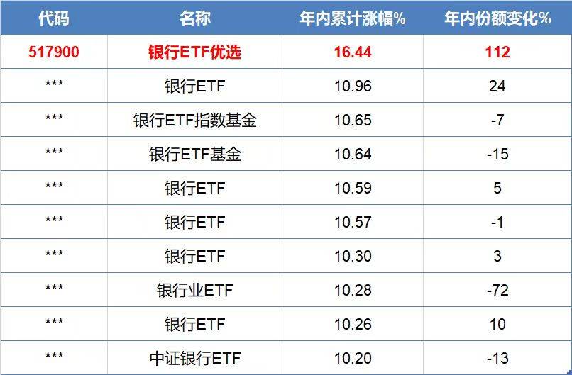 资金自然也会向着更优标的聚集,目前银行ETF优选(517900)年内份额增长超过110%,远期其它银行类基金,想抄作业的朋友要留意咯。