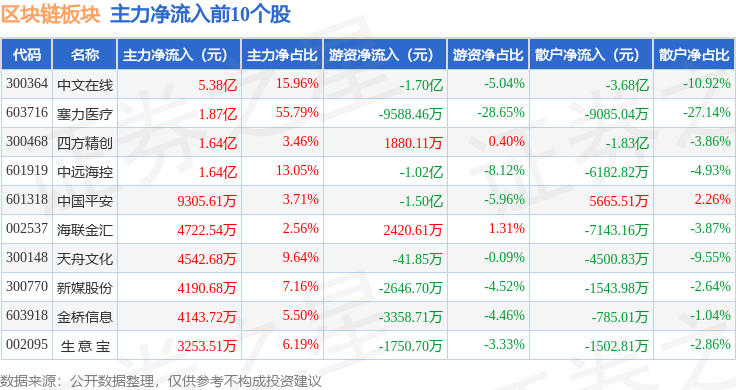 从资金流向上来看,当日区块链板块主力资金净流出63.19亿元,游资资金净流入1.32亿元,散户资金净流入61.86亿元。区块链板块个股资金流向见下表: