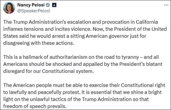对此,当地时间6月9日,美国前众议院议长佩洛西在社交平台上发文抨击称,特朗普政府在加州的“升级和挑衅加剧了紧张局势,煽动了暴力”。“现在,美国总统说,他将逮捕一位在任的美国州长,只是因为后者不同意这些行动。”