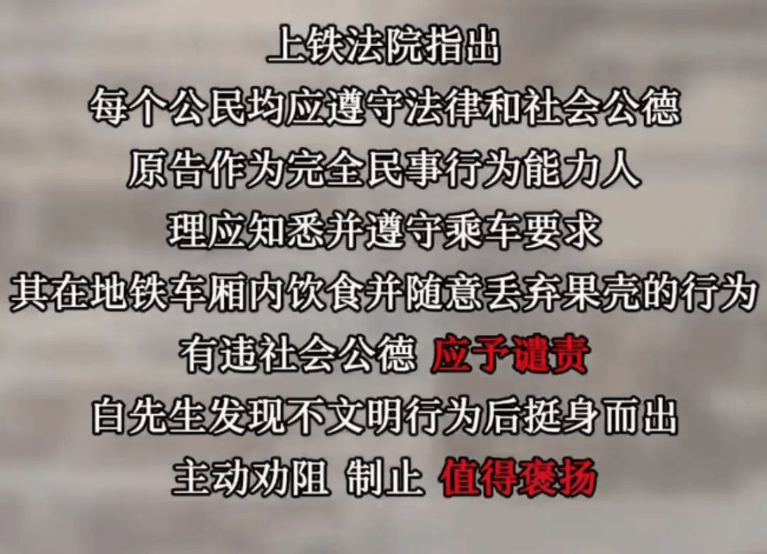 于是法院直接点明:在地铁里乱吃乱扔违规又缺德,白先生挺身而出劝阻,值得点赞!并驳回了原告的全部诉讼请求——所有索赔,一分不赔。