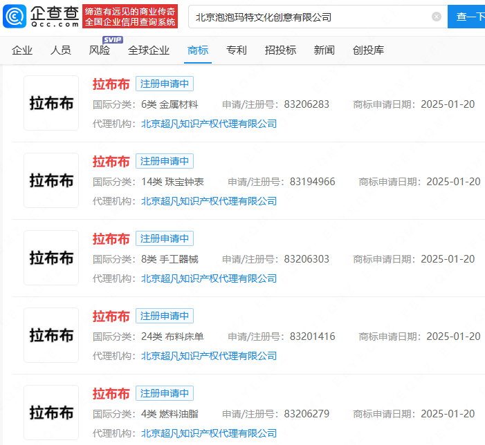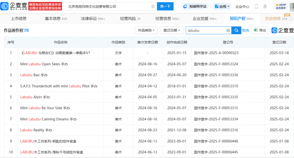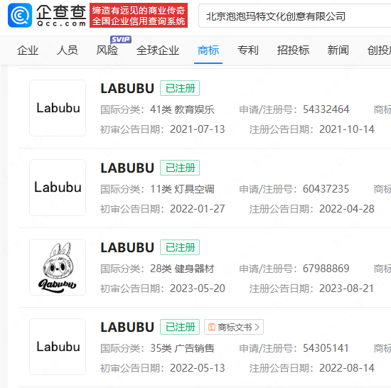 企查查APP显示,北京泡泡玛特文化创意有限公司已申请注册多枚“labubu”“拉布布”相关商标,国际分类为教育娱乐、办公用品、服装鞋帽等,当前部分商标已注册成功。此外,该公司登记多个Labubu作品著作权,其中,“《LABUBU 与朋友们》动画剧集第一季剧本V1”已于今年3月登记,作品类别为文字。