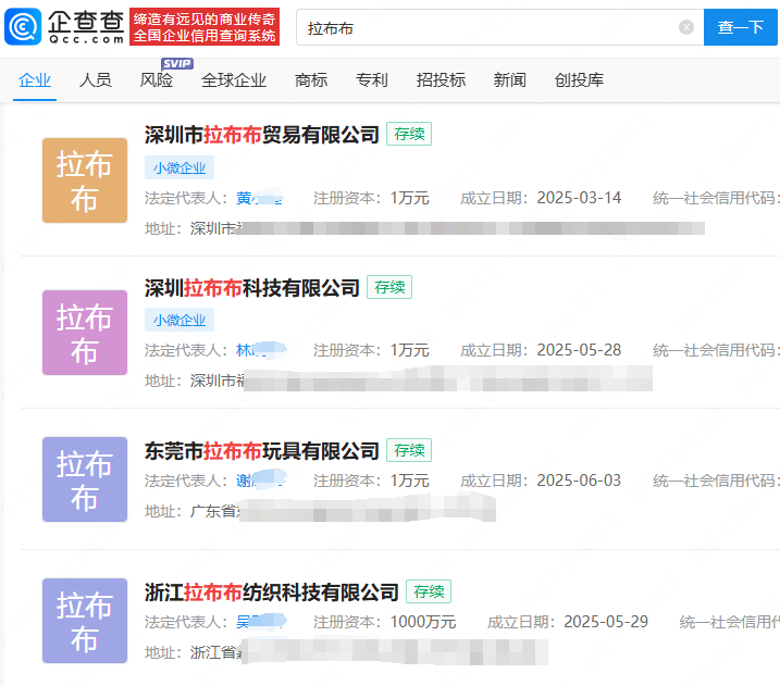 值得一提的是,近期,多家新成立公司以“拉布布”命名,包括深圳市拉布布贸易有限公司、深圳拉布布科技有限公司、东莞市拉布布玩具有限公司等。