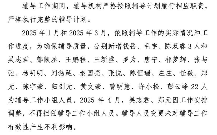 2025年1月和2025年3月,依照辅导工作的实际情况和工作进度,为确保辅导质量,分别新增钱岳、毛宇、陈双睿3人和吴志君等22人为辅导工作小组人员。2025年4月,因工作安排调整,2人不再担任辅导工作小组人员。