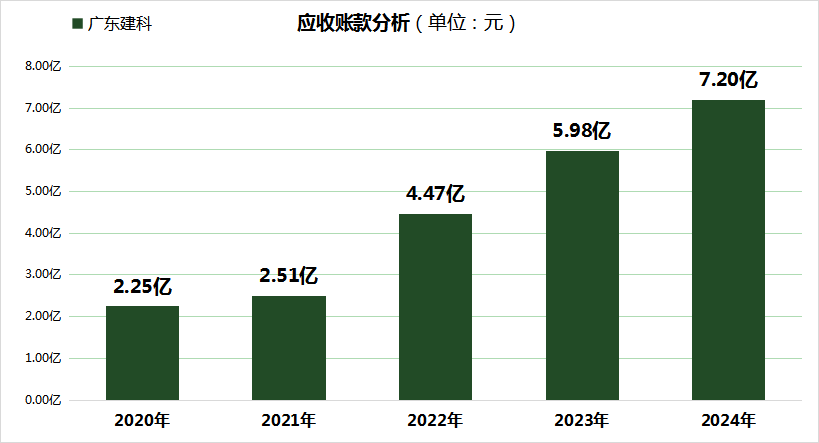根据广东建科的2020年至2024年的应收账款数据来看,其呈现逐年稳步增长的态势,从当年的2.25亿元,增长至2024年的7.20亿元。特别是广东建科2024年的应收账款同比大幅增长20.42%,该年应收账款及合同资产合计账面价值占总资产比例也超过25%。