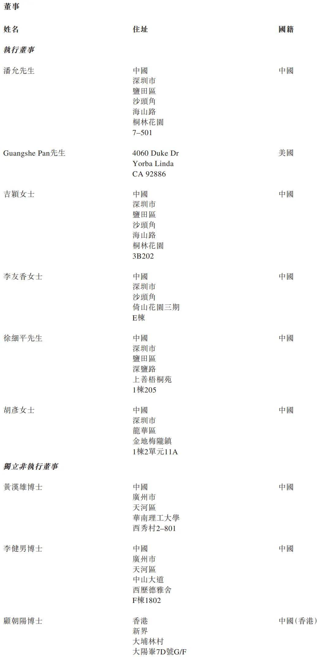香江电器执行董事分别为潘允、GuangshePan、吉颖女士、李友香女士、徐细平、胡彦女士;独立非执行董事分别为黄汉雄博士、李健男博士、顾朝阳博士。